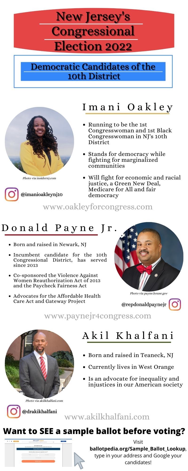 Democratic candidates for the 10th district include Imani Oakley, Donald Payne Jr. and Akil Khalfani, and Republican candidates are David Pinckney and Garth Stewart, according to ballotpedia.org.